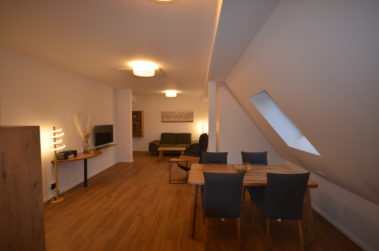 Diese sehr helle Dachgeschosswohnung ist stilvoll eingerichtet und hat eine sehr gelungene Raumaufteilung. Mit der klassisch-stilvollen, offenen Wohnküche und dem Essbereich ist dies ein Apartment, das sich auch für einen längeren Aufenthalt anbietet. Ein großer Abstellraum bietet sich z. Bsp. zum Deponieren für Ihre Koffer an.